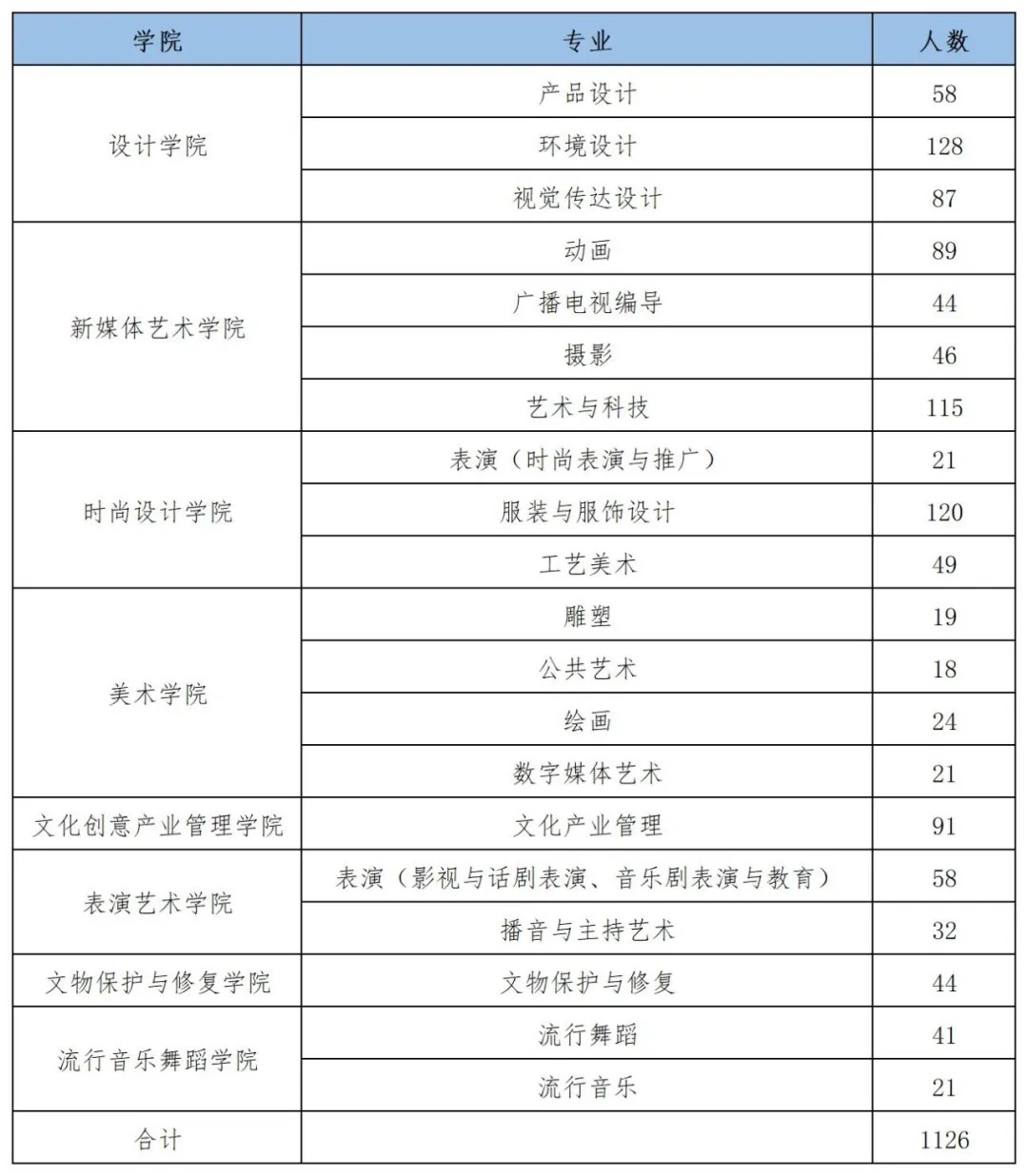 现已开设 “视觉传达设计”“产品设计”“环境设计”“艺术与科技”“数字媒体艺术”“动画”“摄影”“播音与主持艺术”“广播电视编导”“服装与服饰设计”“工艺美术”“绘画”“雕塑”“公共艺术”“表演”“文物保护与修复”“文化产业管理”“戏剧影视文学”“流行演唱流行舞蹈等共计20个艺术类和管理类专业。